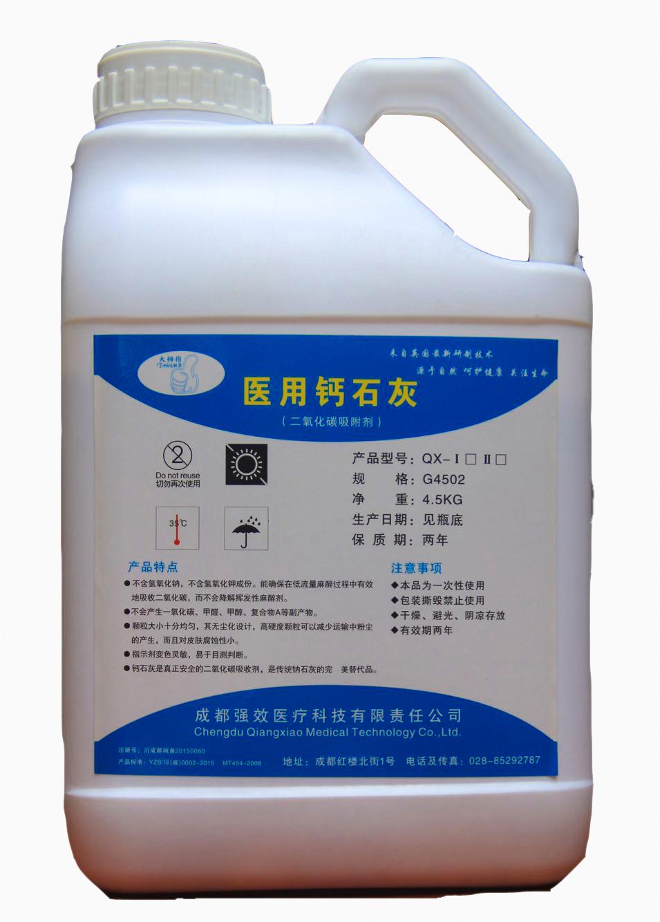 钙石灰:又名二氧化碳吸收剂。产品主要由氢氧化钙、水、指示剂组成,不含钾等强碱物质。产品是一种坚硬多孔、具有高吸收性的颗粒状物品。与其他制剂相比,钙石灰的最大优点是不含强碱性氢氧化钠和氢氧化钾,有助于消除一氧化碳和肾毒性复合物A( compound A)生成,降低或消除呼吸回路起火的可能性。钙石灰主要缺点是:①吸收效率差,较强碱性吸收剂吸收效率降低约50%; ②价格较昂贵。